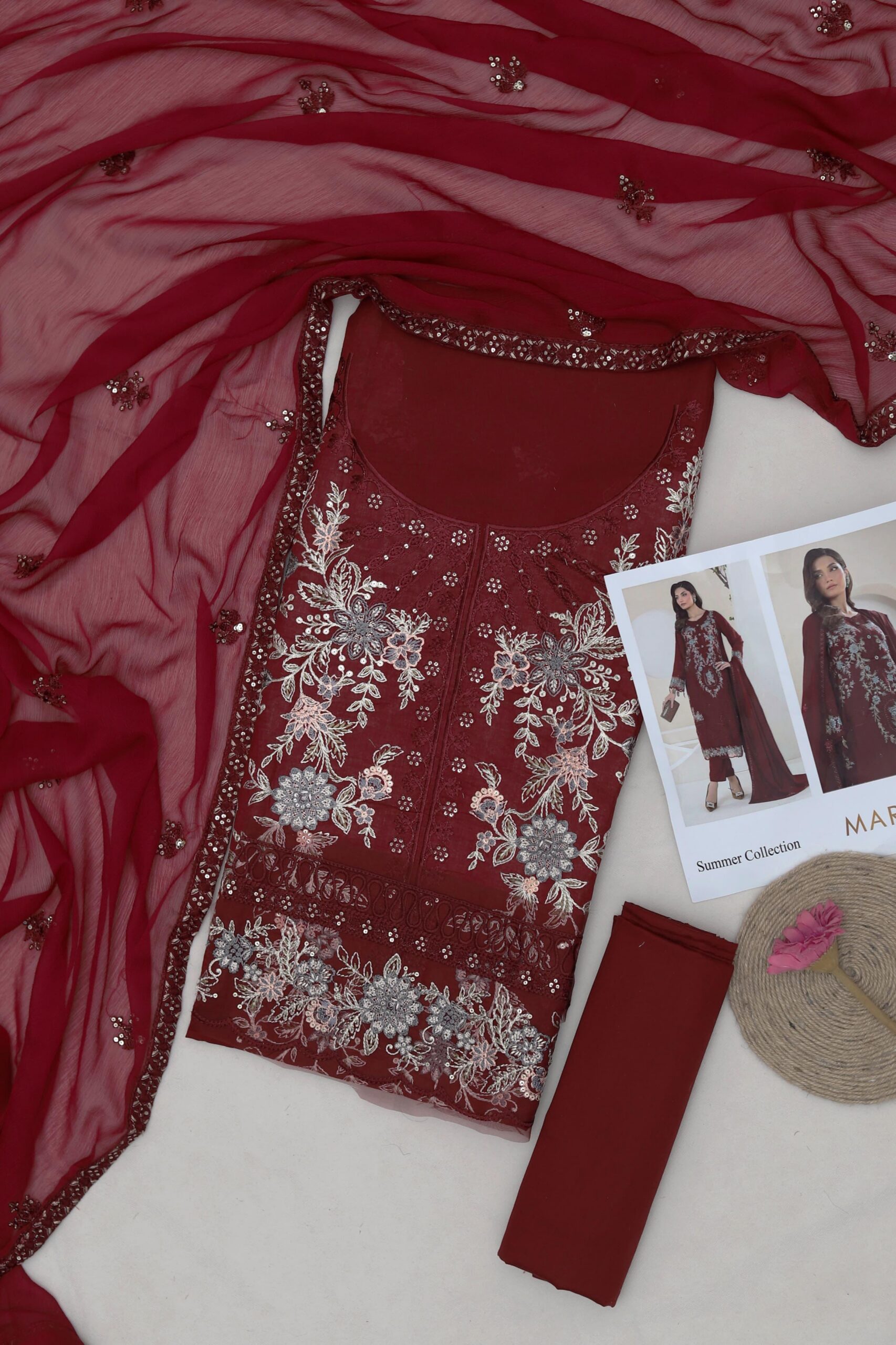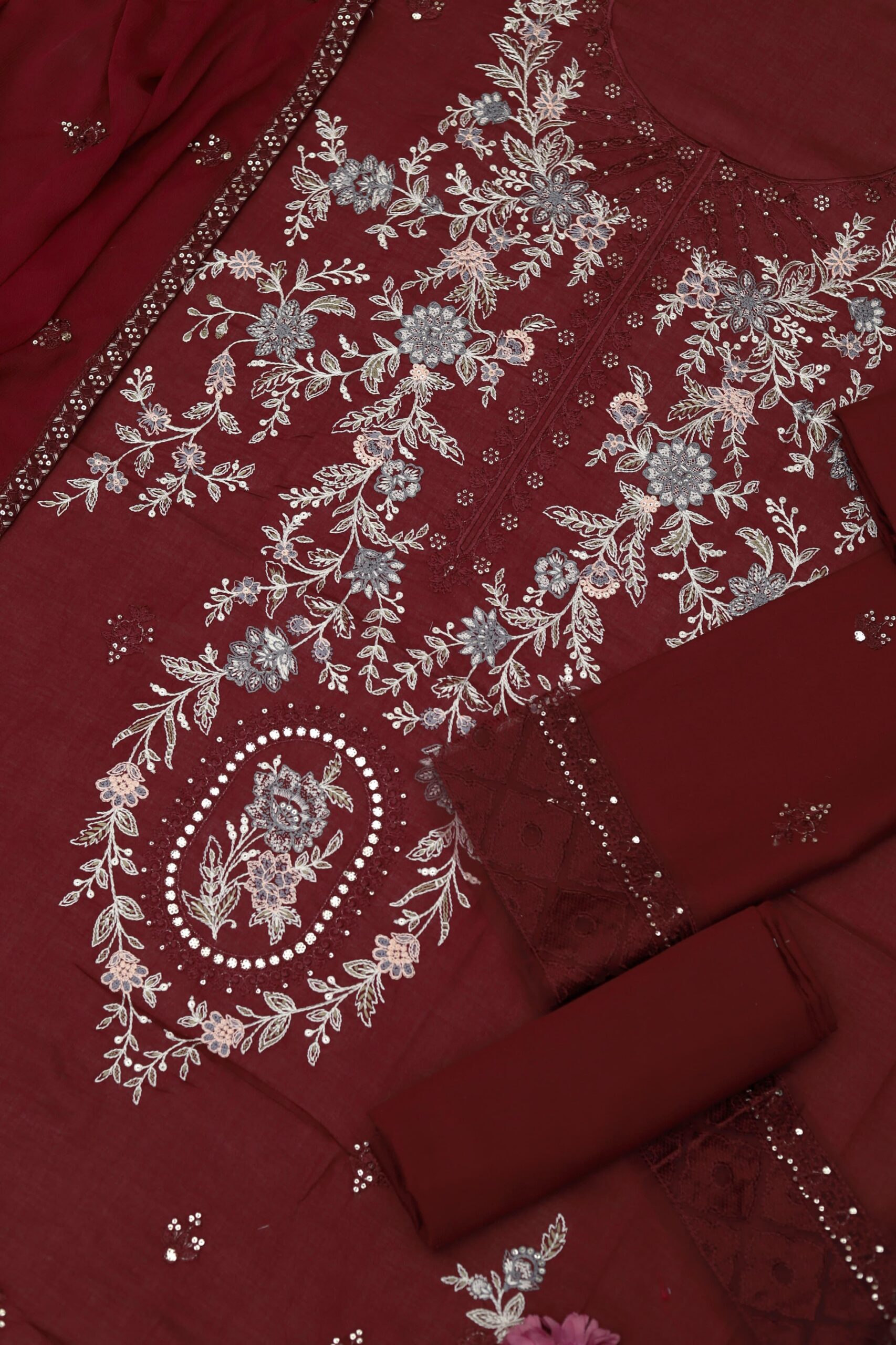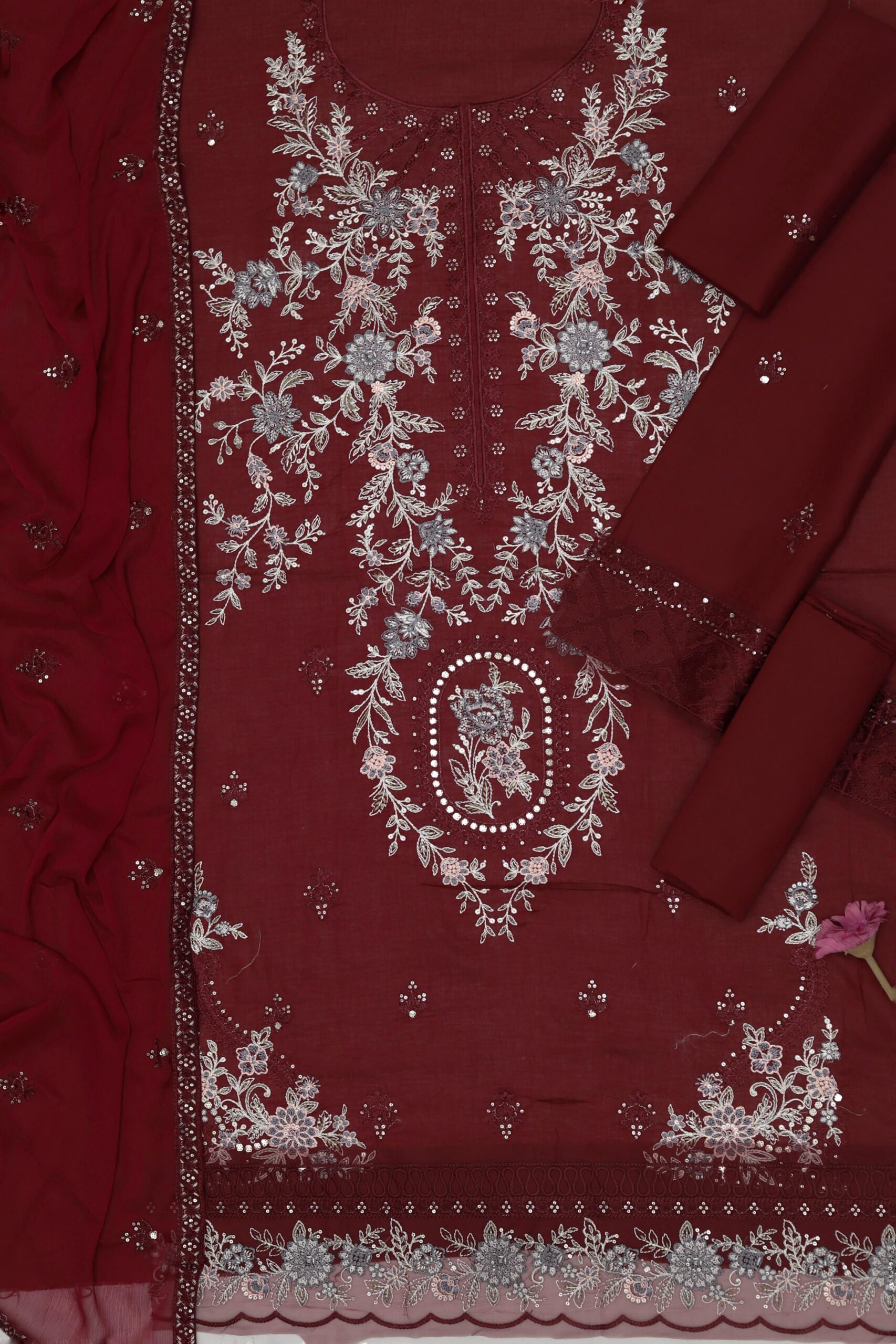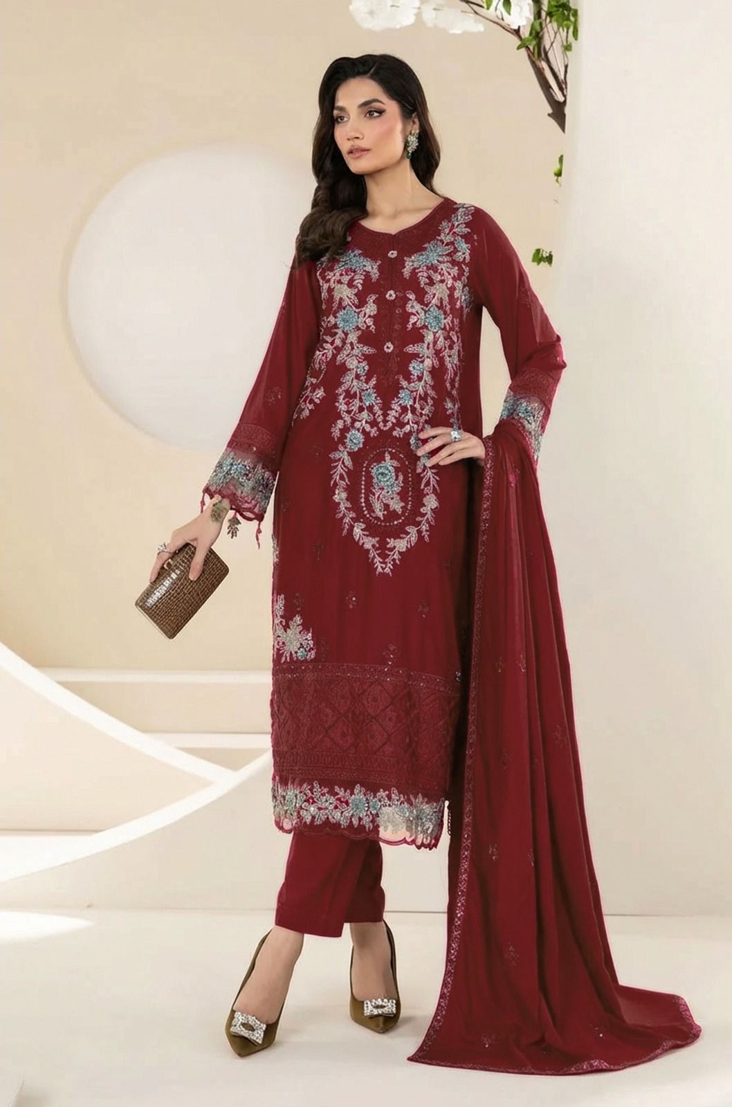 Front Full Heavy Emb Daman heavy embroidery patch Sleeves Full Heavy Emb Back full Heavy embroidered Trouser plain Heavy Emb Chiffon Ready to wear Dupatta